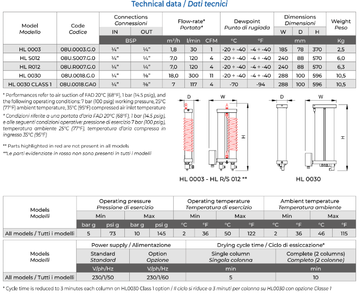La vita e l’efficacia dell’essiccatore dipende dalla rimozione dei contaminati in ingresso. E’ fortemente consigliato quindi l’impiego di pre-filtro a coalescenza tipo HF in ingresso. Si raccomanda inoltre il montaggio di un post-filtro tipo PF in uscita per rimuovere la polvere che potrebbe essersi formata all’interno dei serbatoi.