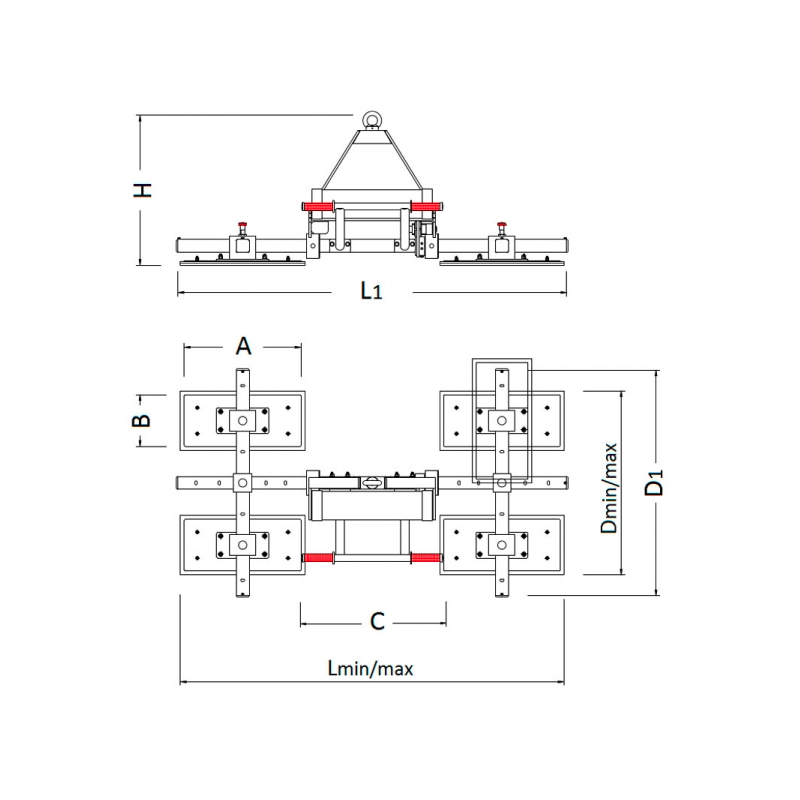 Ventosa di sollevamento a 4 piastre con ribaltamento manuale da 0 a 90°.